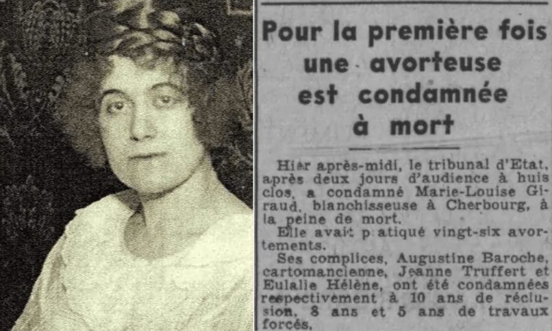 Marie-Louise Giraud, 18 yaşındaki komşusu Gisèle’nin hamileliğini sonlandırmak için hardal banyosu yaptığına şahit olduğunda ona yardım etmeye karar veriyor. Daha sonra 1940-42 yılları arasında 27 kadına kürtaj için yardım ediyor. 1942 yılında, kocası tarafından yazıldığı tahmin edilen, isimsiz bir mektupla ihbar edilen Giraud, kürtaj nedeniyle ölüm cezasına çarptırılıyor. Karar temyiz ediliyor ancak onu cezalandırmakta kararlı olan Vichy Hükümeti temyiz talebini reddediyor. Giraud, Temmuz 1943’te Paris’teki Roquette hapishanesinin avlusunda giyotinle idam ediliyor. Aynı davada yargılanan Eulalie Hélène, Jeanne Truffet et Augustine Connefroy ise sırasıyla 5, 8 ve 10 yıl hapis cezası alıyor.